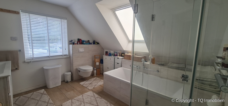 Eine Gas-Zentral-Heizung erwärmt das Haus über eine Fußbodenheizung in jeder Etage und in jedem Raum. Die 3-fach verglasten Fenster bieten viel Schutz vor Kälte und dennoch sind alle Zimmer aufgrund der Größe der Fenster lichtdurchflutet. Drei zusätzliche Veluxfenster mit elektrischen Außenrollläden bringen ebenso sehr viel Licht in das obere Geschoss.