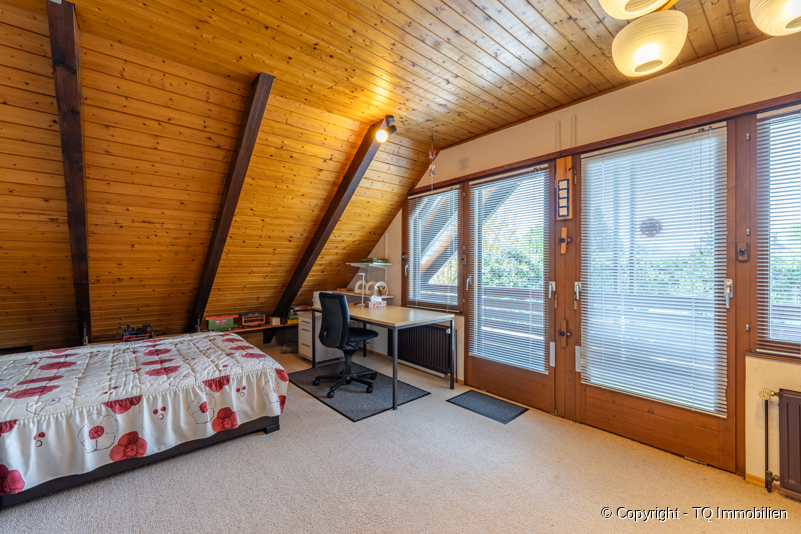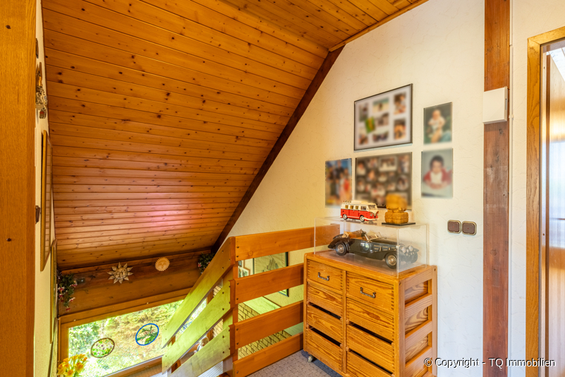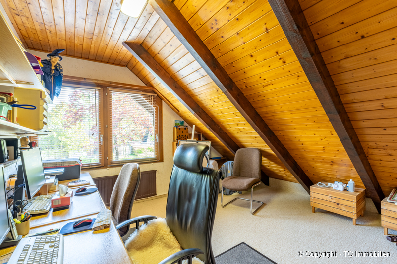 Über den Treppenaufgang, der mit einem Lichtspiel (Treppenhausfenster) versehen ist, gelangt man in das Dachgeschoss. Hier finden Sie ein weiteres Schlafzimmer bzw. Bürozimmer, das große Wannenbad, eine kleine Ankleide und ein weiteres Wohn- oder Schlafzimmer vor. Dieses Zimmer besitzt außerdem einen großen und begehbaren Balkon, mit Blick in den Garten.