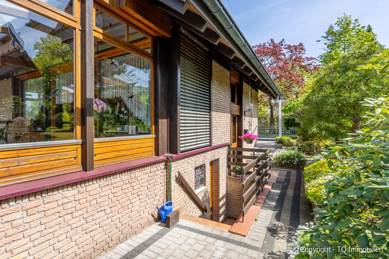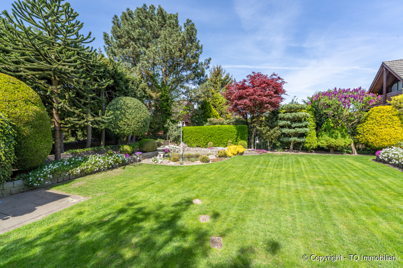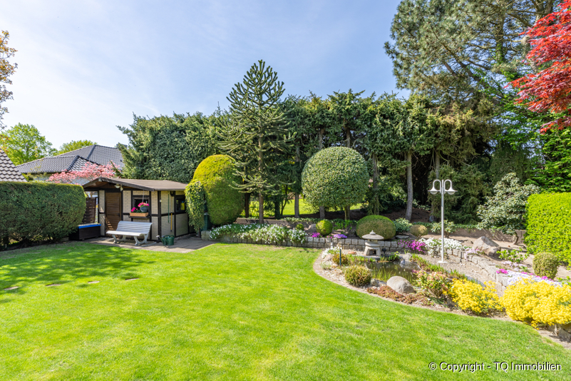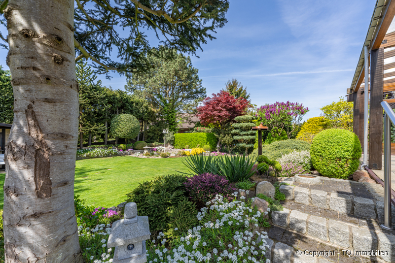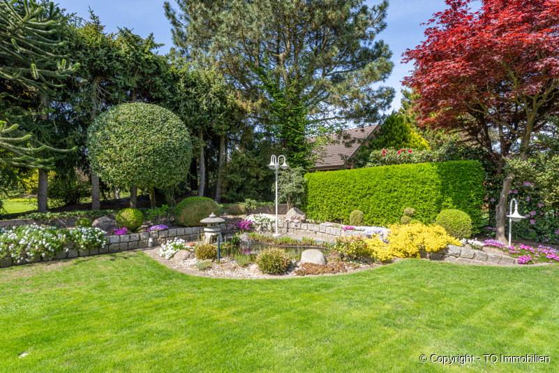 Insbesondere der Garten dieser Immobilie ist sehr zeitintensiv angelegt und bietet alles, was man von einer erholsamen Oase erwartet, inklusive eines kleinen Teichs. Diese Oase bietet viel Platz zum Entspannen und Sonnenbaden. Die Flora besteht aus hochwertigen und speziell ausgesuchten Pflanzen und Bäumen, die teils mit einer speziellen Technik auf Form geschnitten wurden.