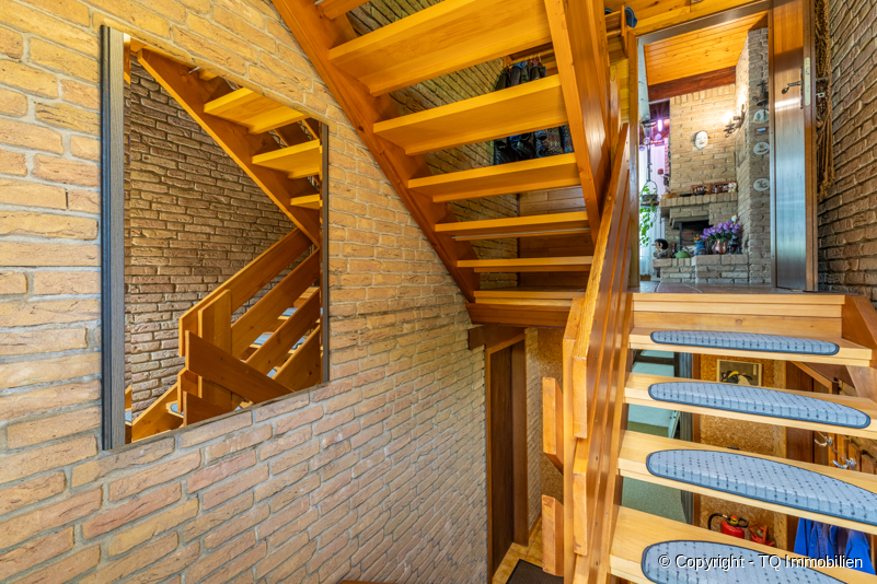 Das Haus besitzt drei Ebenen. Im Erdgeschoss befinden sich nach dem Treppenaufgang, das großzügige Wohnzimmer mit einem Kamin, die voll ausgestattete Wohnküche, das Duschbad sowie ein Schlafzimmer.