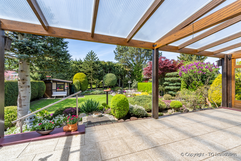 Von der überdachten Terrasse aus, hat man einen unglaublichen Blick in den wunderschön angelegten Garten, welchen man nicht mehr missen möchte.
