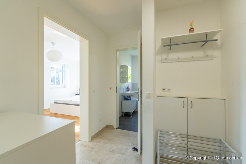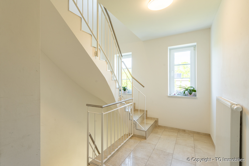 Über das sehr schöne und vor allem helle Treppenhaus gelangt man in die Wohnung. Hier finden Sie eine helle Diele mit Ankleide, ein großes Wohnzimmer mit einer offenen Küche und großem Essbereich, das großzügige Schlafzimmer sowie das moderne Vollbad vor.