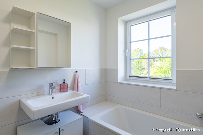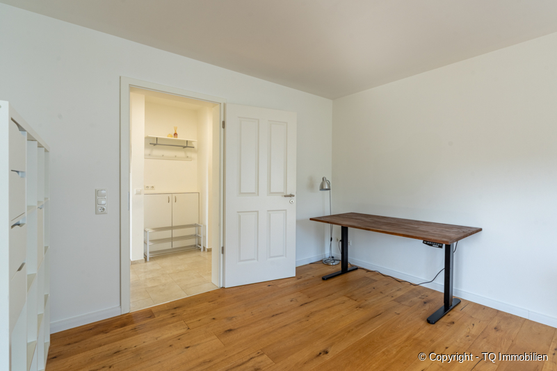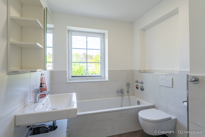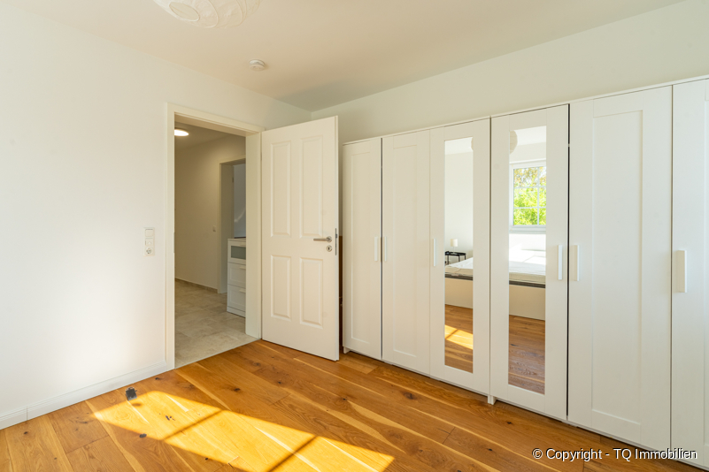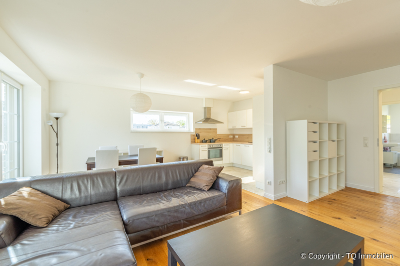 Die Räume besitzen teils bodentiefe Fenster und sind stets lichtdurchflutet. Als Bodenbelag wurden edle Fliesen sowie ein hochwertiger Landhausdielenboden aus Eiche-Parkett verlegt.